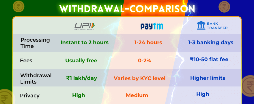 - Added verification: Sometimes requires additional KYC verification beyond the gaming app The key difference lies in processing time and fees. While UPI generally offers instantaneous transfers at no cost, Paytm withdrawals might take 1-24 hours and involve nominal transaction fees when moving money from wallet to bank.