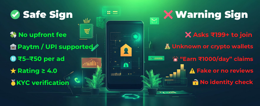 A: You should only provide payment details (like your UPI ID or Paytm number) to apps you have verified as legitimate and trustworthy, and only when you are actually requesting a withdrawal after reaching the threshold. Never provide full bank account numbers, IFSC codes, or card details unless absolutely necessary for a verified platformâs standard payout process (UPI is generally safer). Never pay a fee to withdraw your earnings. Use the safety checklist in this article!